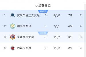 晋级8强!女足亚冠B组积分榜:武汉女足2胜1平积7分第1!