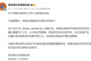 体育资讯11月24日讯 针对球员兰克尔·泽指控拖欠工资,以及其他一系列风波,青岛海牛发布了官方说明。